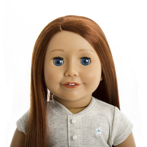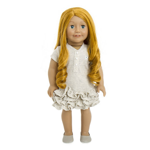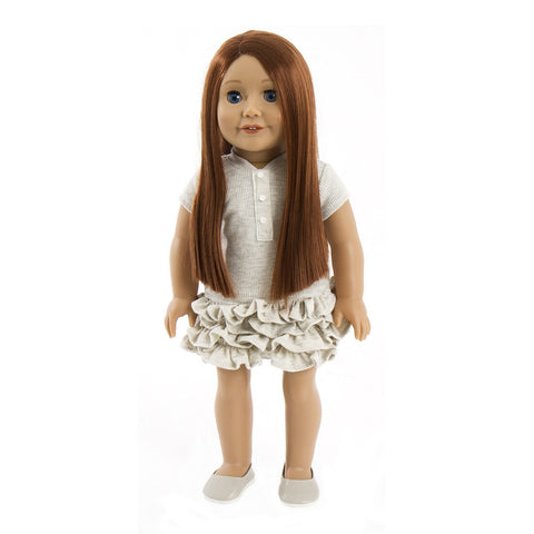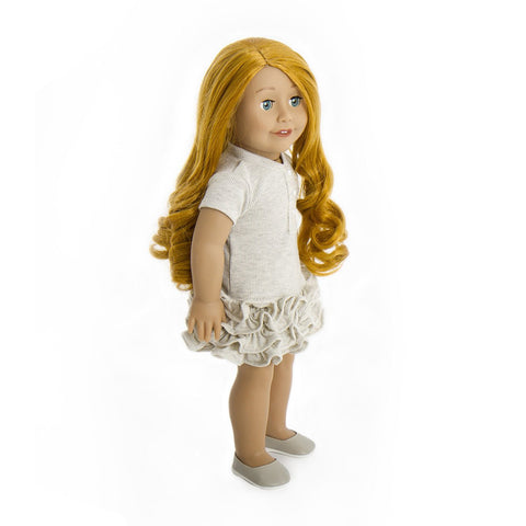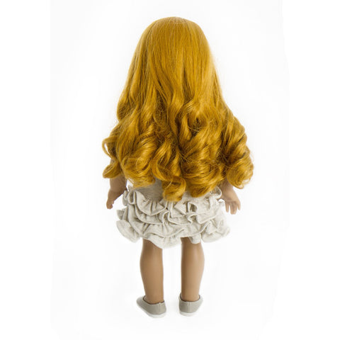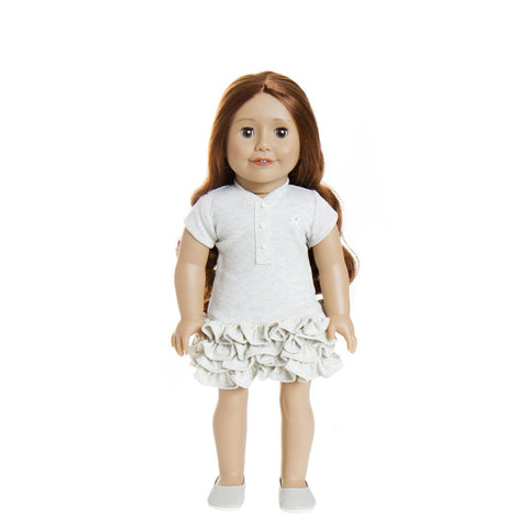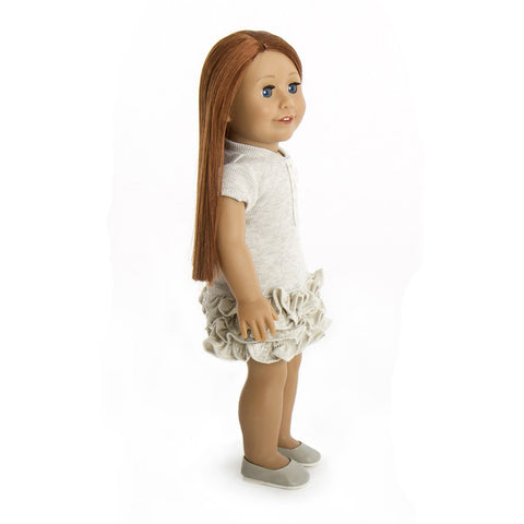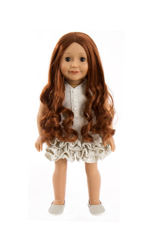 Our beautiful fair skin doll 16 with piercing blue eyes, and long curly red hair and left side parting.  She comes complete in her bespoke grey dress with ruffled end and beautiful Treasured Dolls flower motif, also included is her faux leather grey mules and underwear. Her skin is high quality vinyl with cloth body perfect for cuddles. Her eyes open for daytime adventures and close when your fun is over and it’s time for bed. With moveable limbs she will make a great companion.