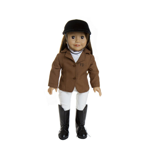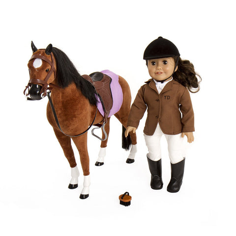 CHARLOTTE with shoulder length brown layered hair and gorgeous brown eyes, wearing her beautiful brown riding outfit. Charlotte loves horse riding, her dream is to work as a horse trainer. She spends her evenings at the stables cleaning out for her horse Fable. Together they love to spend time trotting through the fields and exploring. Fable loves when Emily plaits his mane and tail. Their friendship is so important to them both.