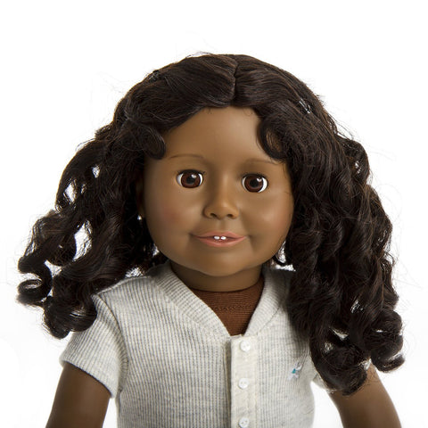 Our stunning dark skin doll 10 with pretty brown eyes and short black tightly curled hair.  She comes complete in her bespoke grey dress with ruffled end and beautiful Treasured Dolls flower motif, also included is her faux leather grey mules and underwear. Her skin is high quality vinyl with cloth body perfect for cuddles. Her eyes open for daytime adventures and close when your fun is over and its time for bed. With moveable limbs she will make a great companion