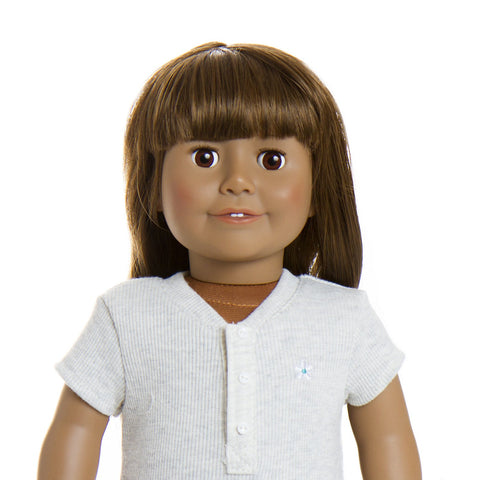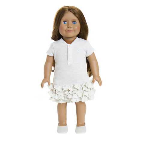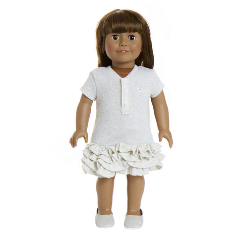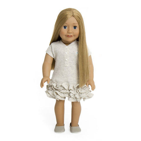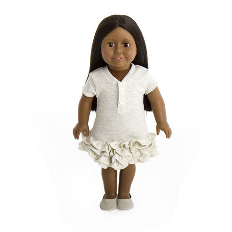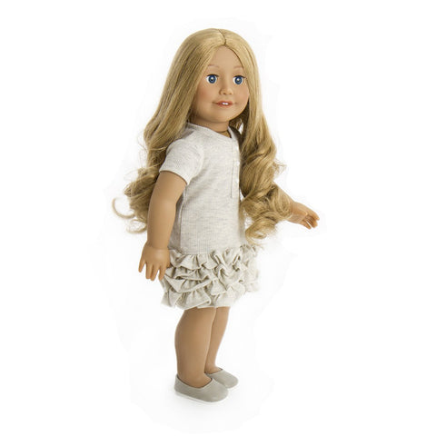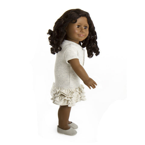 Our beautiful medium skin doll 8 with striking blue eyes, she comes with long curly light brown hair. She comes complete in her bespoke grey dress with ruffled end and beautiful Treasured Dolls flower motif, also included is her faux leather grey mules and underwear. Her skin is high quality vinyl with cloth body perfect for cuddles. Her eyes open for daytime adventures and close when your fun is over and its time for bed. With moveable limbs she will make a great companion