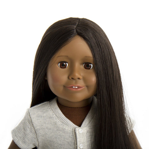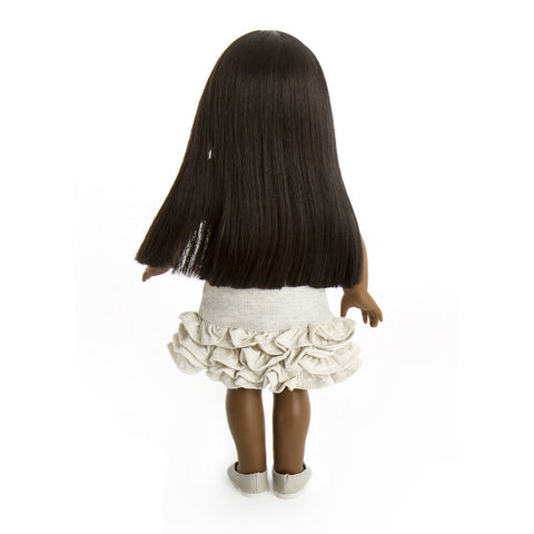 Our stunning dark skin doll 11 with deep brown eyes, long straight black hair perfect for styling.  She comes complete in her bespoke grey dress with ruffled end and beautiful Treasured Dolls flower motif, also included is her faux leather grey mules and underwear. Her skin is high quality vinyl with cloth body perfect for cuddles. Her eyes open for daytime adventures and close when your fun is over and it’s time for bed. With moveable limbs she will make a great companion.
