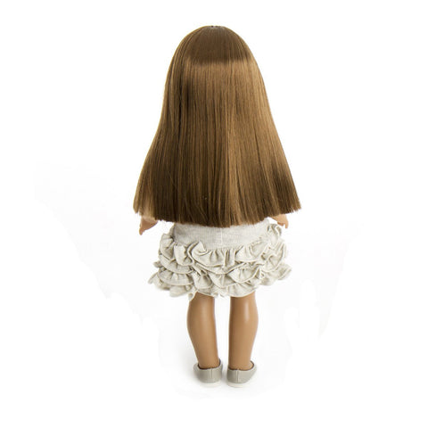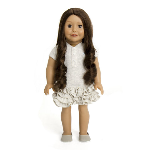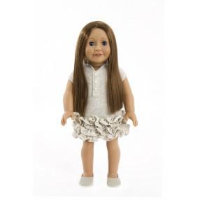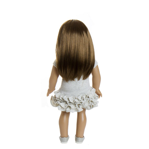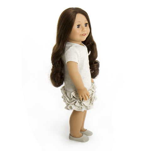 Our beautiful fair skin doll 15 with piercing brown eyes, and long curly dark brown hair and side parting.  She comes complete in her bespoke grey dress with ruffled end and beautiful Treasured Dolls flower motif, also included is her faux leather grey mules and underwear. Her skin is high quality vinyl with cloth body perfect for cuddles. Her eyes open for daytime adventures and close when your fun is over and it’s time for bed. With moveable limbs she will make a great companion.