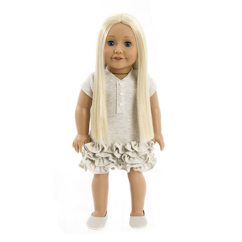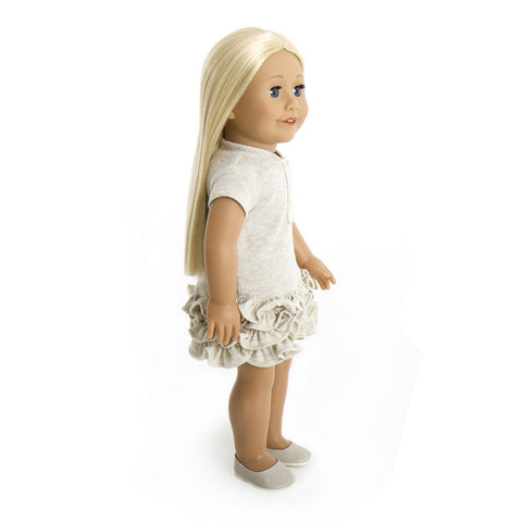 Our beautiful fair skin doll 17 with ocean blue eyes,  and long straight ash blonde hair. She comes complete in her bespoke grey dress with ruffled end and beautiful Treasured Dolls flower motif, also included is her faux leather grey mules and underwear. Her skin is high quality vinyl with cloth body perfect for cuddles. Her eyes open for daytime Adventures and close when your fun is over and it’s time for bed. With moveable limbs she will make a great companion.
