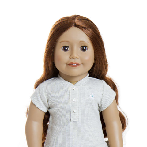 Our beautiful fair skin doll 26 with chocolate brown eyes, long curly, center parting  auburn hair. She comes complete in her bespoke grey dress with ruffled end and beautiful Treasured Dolls flower motif, also included is her faux leather grey mules and underwear. Her skin is high quality vinyl with cloth body perfect for cuddles. Her eyes open for daytime adventures and close when your fun is over and it’s time for bed. With moveable limbs she will make a great companion.