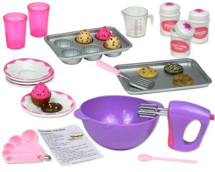 Your TREASURED Girl can be a cake boss when she's in the kitchen with this 26 piece Baking Accessories Set. Your 18" doll will enjoy the mixer and mixing bowl,  plates and cups, canisters for flour, sugar and chocolate chips, a measuring cup, a cookie sheet complete with cookies, a cupcake tray complete with cupcakes, a spatula, measuring spoons & a recipe card.  Cookies, cakes, pies...bake away with all of the 18" doll baking accessories in this complete 23 piece set. Baking Set now comes in all new colors packed beautifully in a decorative window box!